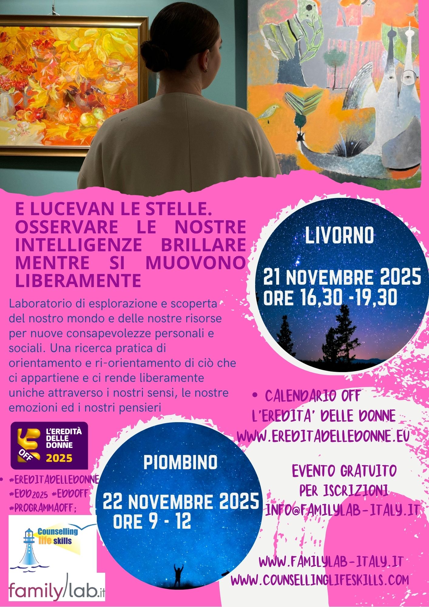 Il nostro impegno per una nuova cultura legata al mondo femminile ed all’empowerment anche questo anna ci porta a partecipare all’evento L’eredità delle donne. Questo anno saremo presenti sia a Livorno che a Piombino con un laboratorio tutto da vivere e scoprire, come le stelle! Vi aspettiamo!